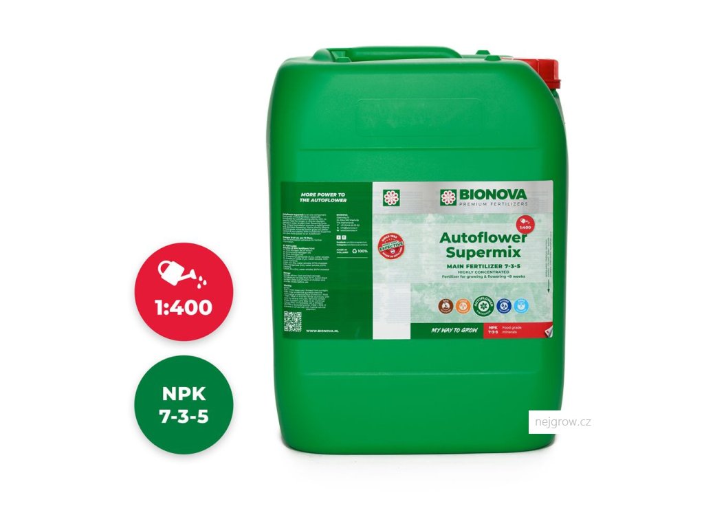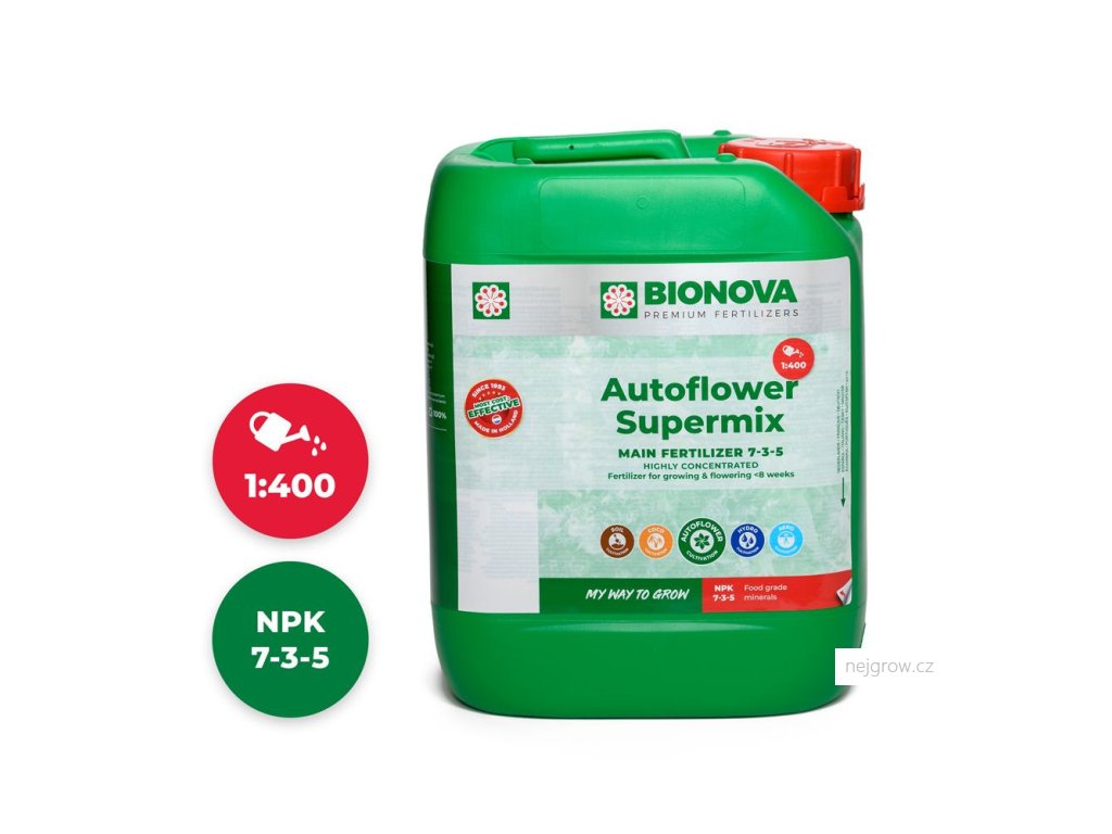 Organické přísady v BioNova AutoFlower Supermix stimulují vlastní produkci hormonů, podporují imunitní systém a onemocnění nižšího míru, posilují kořenový systém, zahrnují čisté hormony závlahových systémů, podporují prospěšné mikroorganismy.