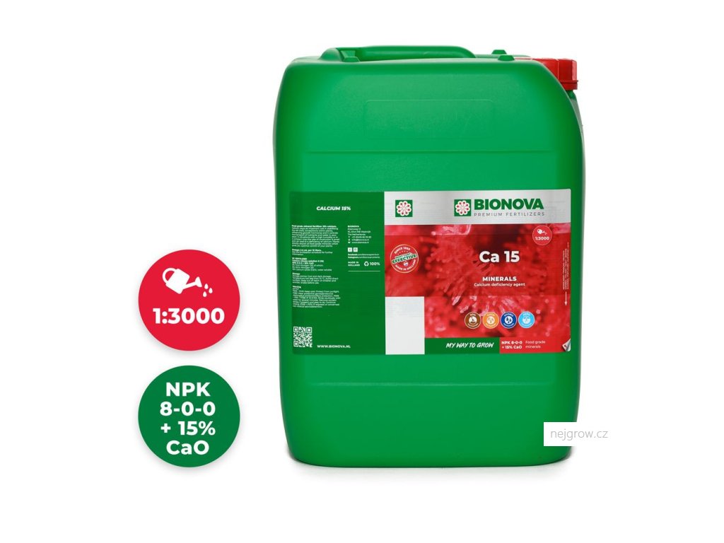 BioNova Ca 15 je univerzální přísada, která obsahuje 15% (180 g/l) čistého vápníku, 8% dusíku a stopové prvky železa, mědi a manganu.
