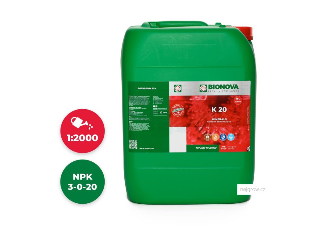 Hnojivo K 20 by se mělo aplikovat při výskytu nedostatků a/nebo pro zrání a zlepšení pevnosti. K 20 je mísitelný se všemi hnojivy Bionova, stimulátory, minerály, univerzálními hnojivy a substráty. K 20 lze použít k zavlažování.