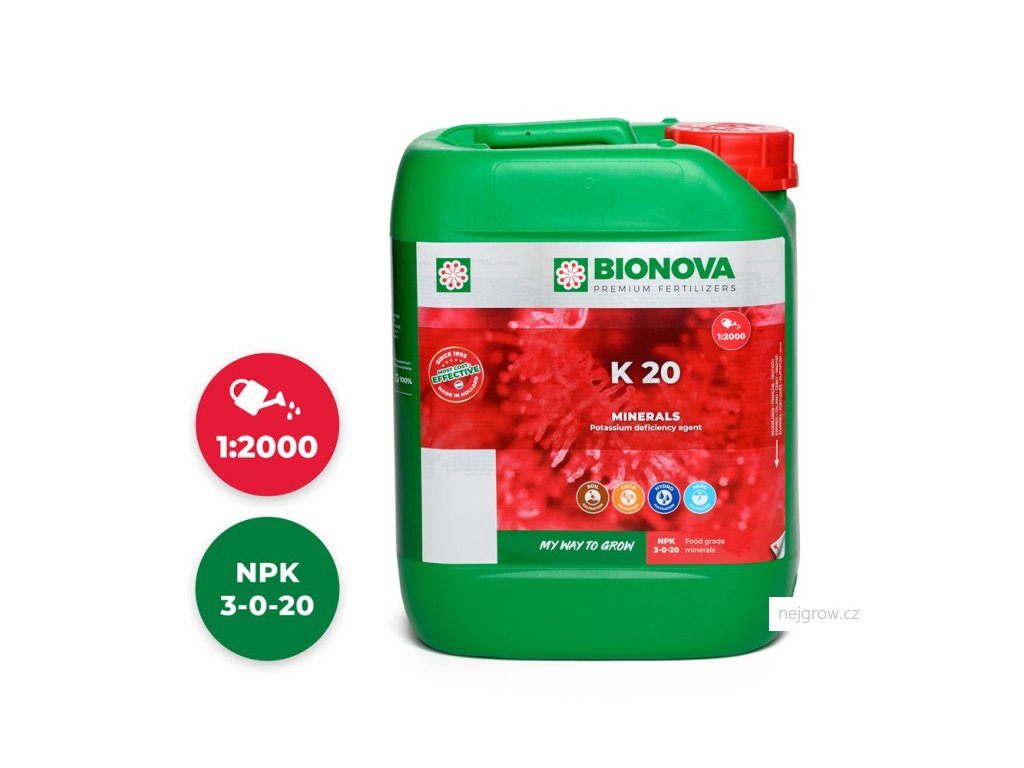Kromě základních prvků N a P je pro každé pěstování zásadní i K20 (draslík). Draslík posiluje buňky (uchovává vodu) a podporuje kvetení.
