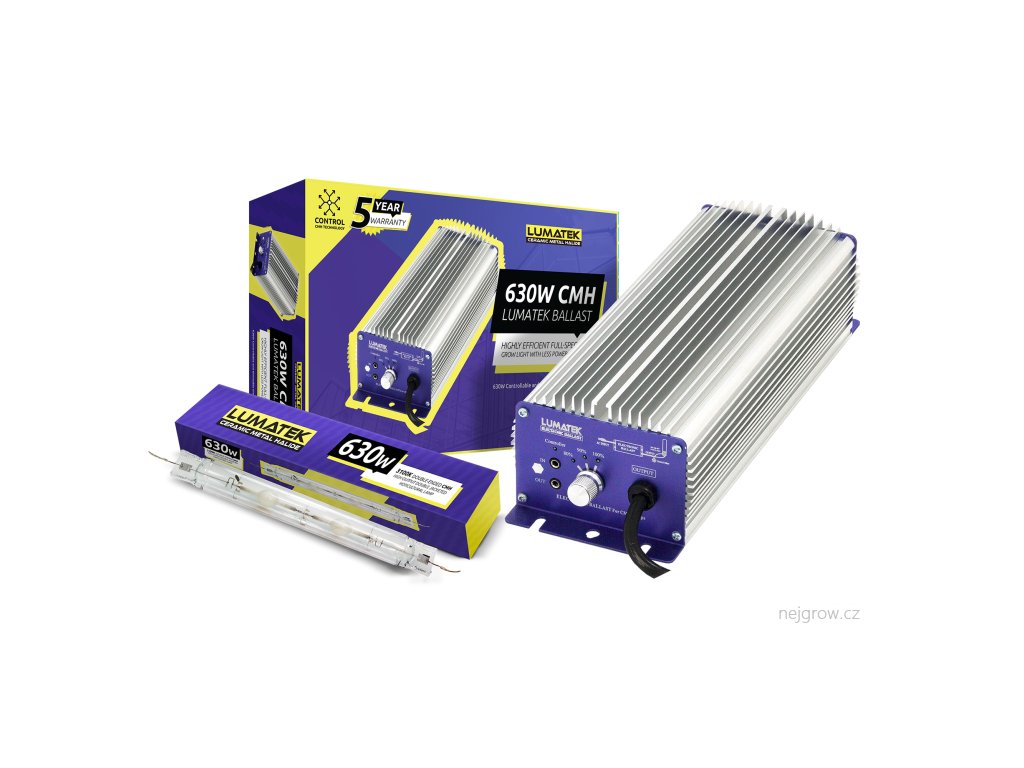 Digitální předřadník Lumatek CMH Controllable 630W s IEC konektorem a výbojkou double ended Lumatek CMH 630W. Technologie CMH produkuje více než 90% CRI (Index podání barev), což podporuje vyšší PAR hodnoty než tradiční osvětlení HID, MH nebo HPS. Nižší výhřevnost, více světla, optimální kontrola. Tichý a bezpečný provoz bez blikání výbojky je samozřejmostí. Pěstování s kitem CMH Lumatek 630W zajišťuje zdravé a bohaté sklizně.
